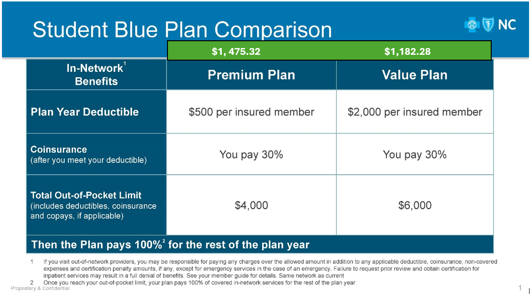 Cost per semester for Blue Cross Blue Shield Value plan is $1,226.80 (undergraduate) or $1,396.54 (graduate) and the optional Premium plan is billed at $1,583.50 (undergraduate) or $1,802.92 (graduate); coverage is continuous during holidays and summer breaks, or