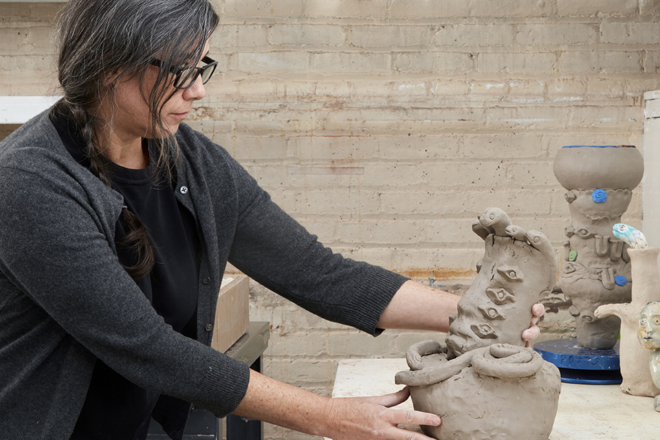 Working in clay again, she was reminded of her time in the studio with Design & Production Emeritus Faculty member Martha Dunnigan. “Martha was sly and gentle in her method, but absolutely held us all in her thrall,” Potts says. “I hear her in my ear in the studio whispering, ‘clay has a memory,’ a phrase anyone who works with clay has heard a million times, but I swear to you she said it first. Well, she said it to me first.”