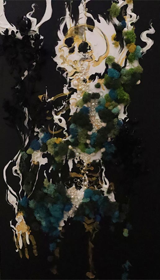 I don’t cry a lot, and it’s something that I definitely used to be concerned about, but it also led me to a certain level of dissatisfaction. Growing up I was eventually always told that crying is good and it lets you release everything emotionally pent up inside of you. When emotions became particularly overwhelming, I always tried to cry because I was told it would relieve me of all those stressful negative feelings, but no matter how hard I tried, crying never came naturally to me. I didn’t understand why it was so difficult, especially when I hear my friends say how they cry three times a day “just because that’s how it is.” I wanted to take this thesis as an opportunity to try and visualize this bodily occurrence for myself and others. Not being able to cry reminds me of the stiffness in an unnatural motion, so I decided to transfer that stiffness through elements of moss and metal. The moss reminds me of something being stuck in place for a long time, so it reduces the sense of normal bodily movement, and the metal specifically focused around the spinal cord area is meant to emphasize the rigidness throughout that area of the figure. While representing stiffness, these materials are also meant to represent build up. Trying to cry is a forceful movement for me, so the metal and along with that the pearls double in representation of an attempt to cry being forcefully blocked buy the dominating presence of the moss. The final important compositional decision is the golden skeleton. What I’m trying to show in this piece is something I want the viewer to interpret as an out of body or almost dissociative experience, so I decided to visualize that through showing the skeleton on top of the figure. I decided a skeleton would be the best way to represent this because while they are associated with the word “human”, they alone still have a very unnatural and unnerving appearance. The figures appearance is overall meant to help visualize this very stagnating and upsetting scenario for the viewer in a way that helps them understand how it feels physically, while also aesthetically presenting in a way that shows it’s okay and natural and some people just don’t “cry” how others do.