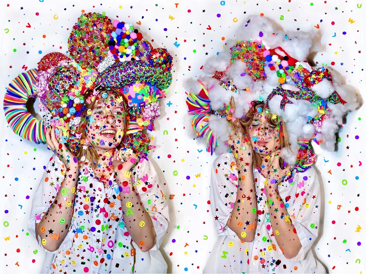 The Band-aid Solution is a diptych designed to blend together and features a before and after scene of a wearable sculpture and its destruction. The sculpture displays a wire base, surrounded by irregularly shaped fabric pillows and ultimately covered in ornamentation (rhinestones, beads, puff balls, stickers, pipe cleaners and googly eyes). The sculpture is designed as a wearable head piece and is centered around the childish solutions to ugly problems.