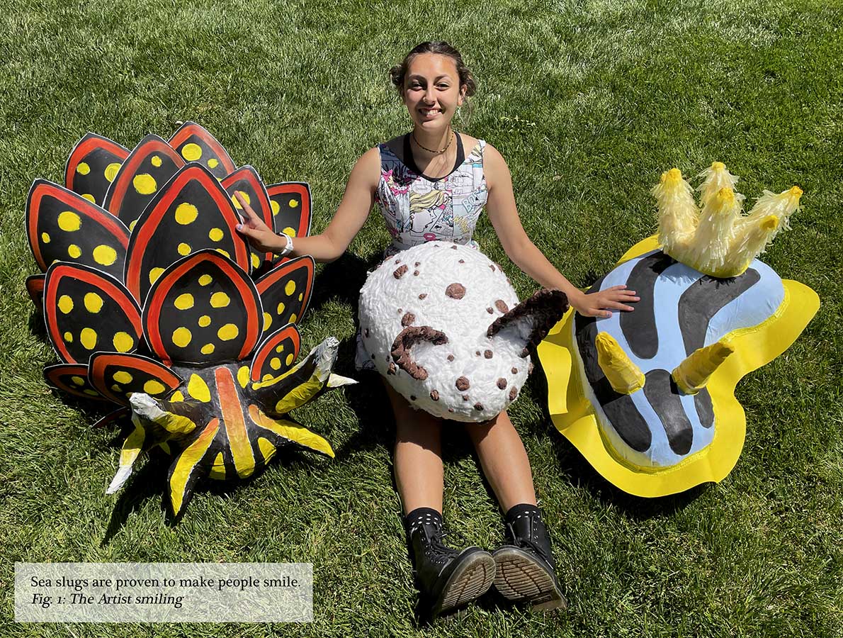 In creating my giant sea slugs, I wanted to bring these tiny amazing creatures from the tropical waters to the center stage, making them impossible to overlook. In actuality, these fellas are only about 3 centimeters long, and with over 3,000 species, very little is known about their biology. However, each new piece of information discovered has led to bursts of biological innovation, from cancer treatments to insights on climate change. Their vibrant blades communicate menace and danger, yet their genetics have helped hundreds. Inspired by their evolutionary excellence, I want to broadcast their information to the world.