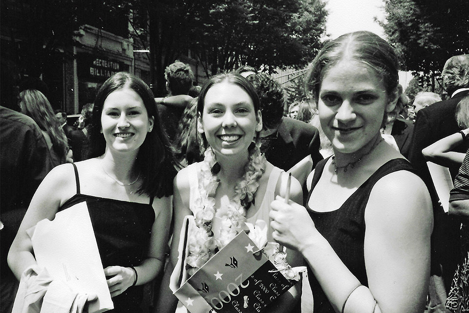 Kelly McConkey, center, with friends after her UNCSA graduation at the Stevens Center.
