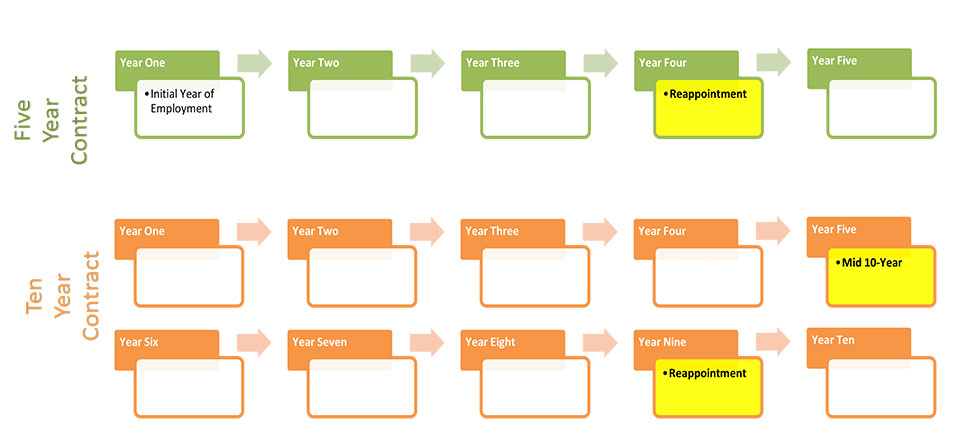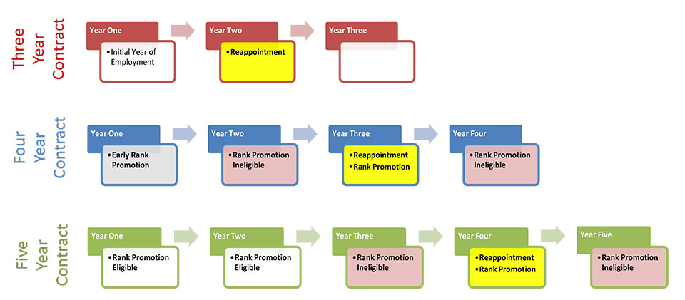 Eligible faculty are strongly encouraged to apply for rank promotion at the same time they undergo contract reappointment evaluation. In these cases, faculty may use the same evaluative materials for both processes. Faculty who elect to apply for rank promotion during a rank promotion eligible year outside of the contract reappointment evaluation year may not use any prior evaluative materials.