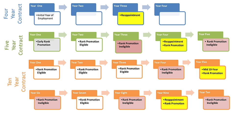 Refer to the Rank Promotion Eligibility Paths to determine your eligibility for rank promotion. Faculty who are in their first multi-year contract, regardless of length, are not eligible for rank promotion. Faculty who are eligible to apply for rank promotion must discuss their readiness for rank promotion with their dean before submitting a Letter of Intent.