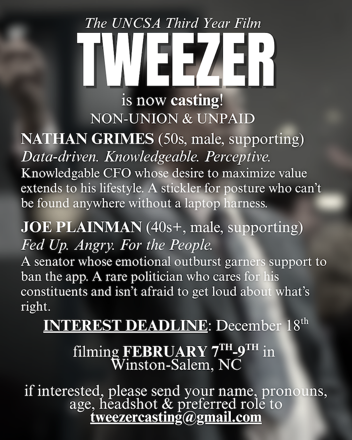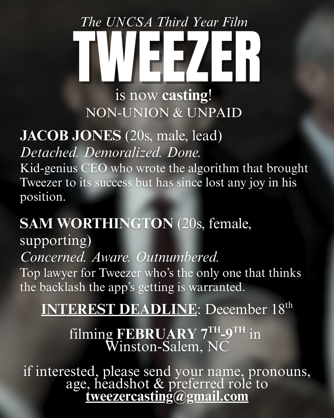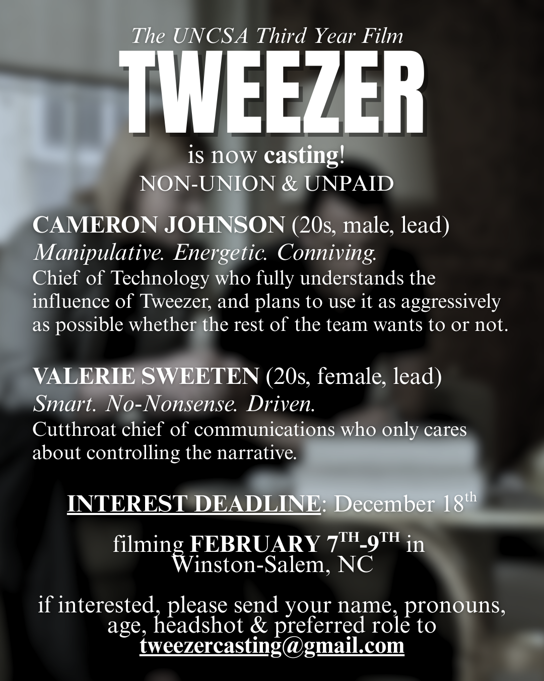 TWEEZER, a UNCSA third-year film is now casting! It's an unpaid and non-union student film shooting February 7th-9th, 2026.