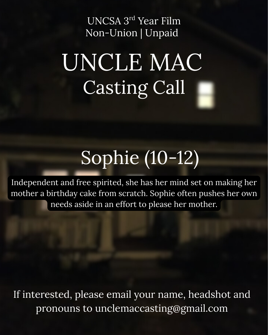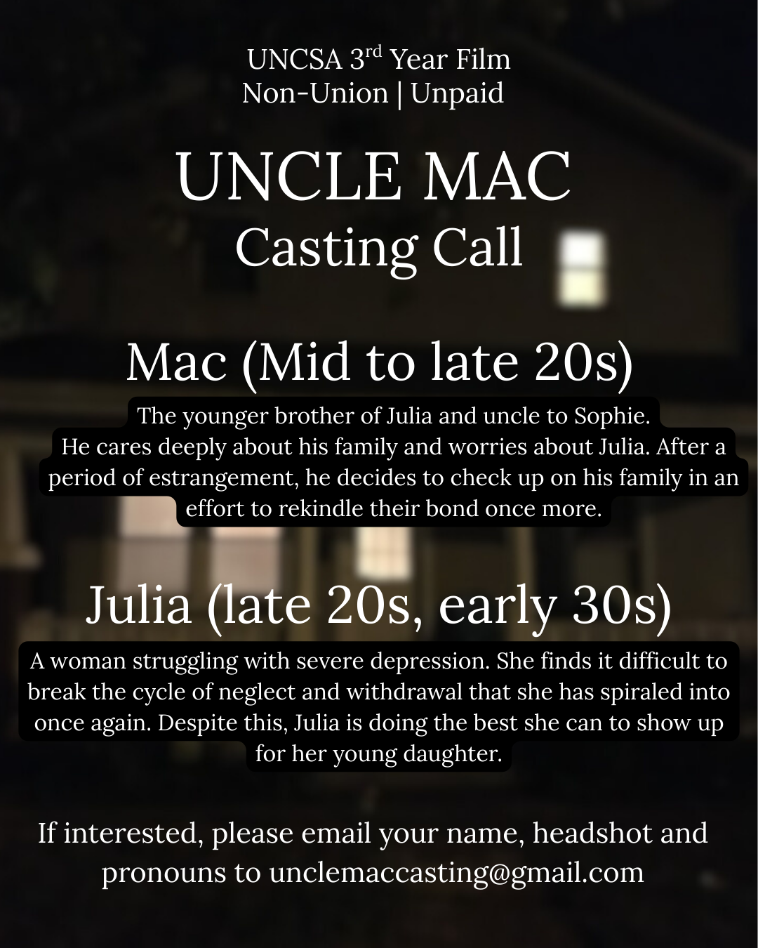 interested in auditioning for these roles, send your name and headshot to unclemaccasting@gmail.com for