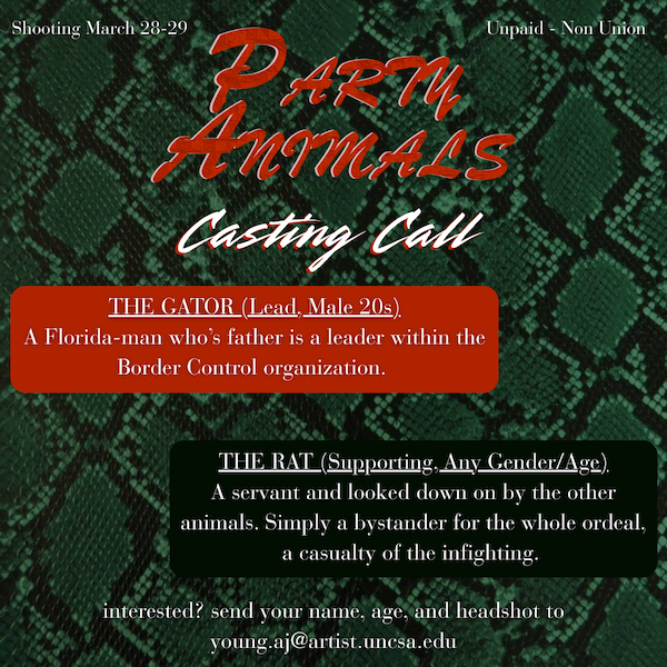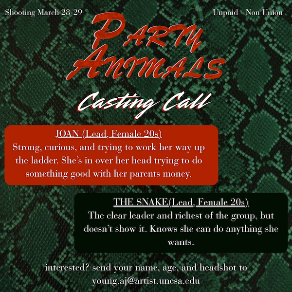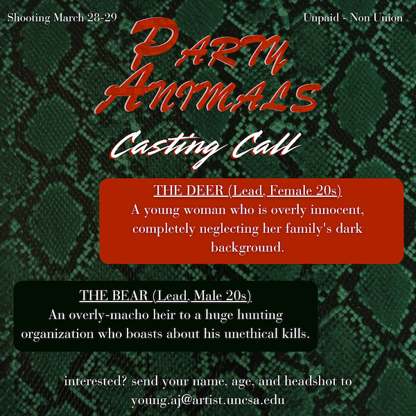 Hello everyone! Casting has begun for the UNCSA Second Year film, "Party Animals."