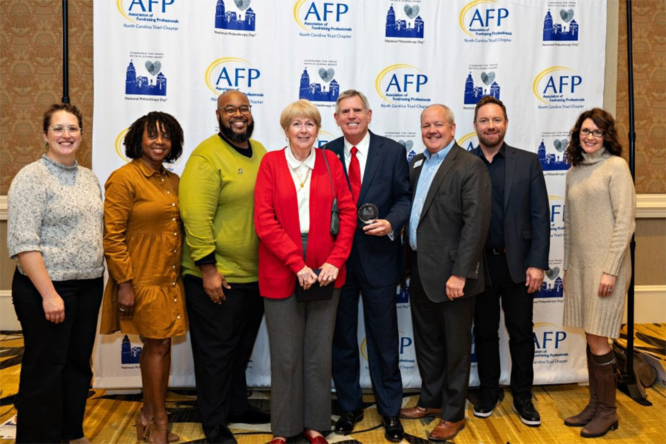 Judy and Bob McNair (center) at the 2023 Triad National Philanthropy Day Luncheon, along with (from left to right) Kait Dorsky (University Archives), School of Dance Dean Endalyn Outlaw, Rob Myers (Admissions), Rich Whittington (Advancement), School of Music Dean Saxton Rose, and Shannon Wright (Advancement)