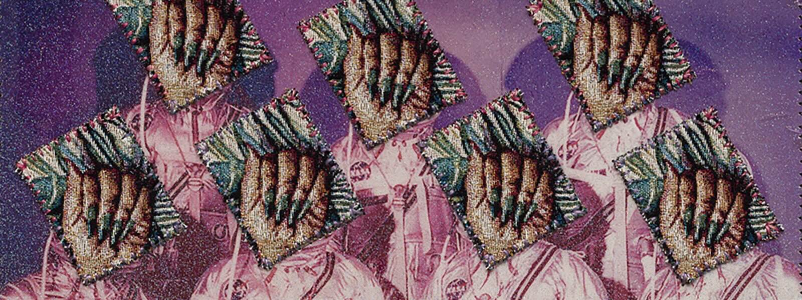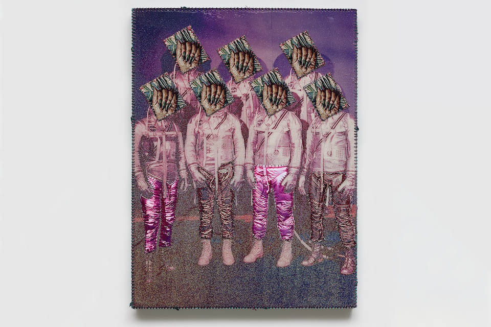 “Come in my Temple,” April Bey, 2024, CMYK halftone hand-printed image transfer, watercolor on gessoboard hand-sewn into metallic vinyl wrapped wood panel