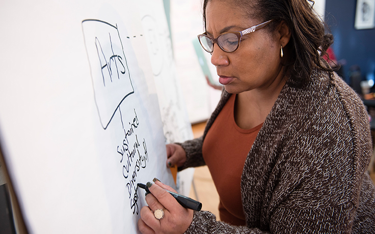Lab members gathered for a two-day workshop April 22-23 at the Center for Design Innovation. Since beginning work last fall, the group has moved from understanding the dynamics of the system — one in which inequities in employment, income and wealth persist — toward developing significant interventions that could change the system. The interventions are designed to disrupt ingrained mindsets and structures that drive the way things now work in Winston-Salem while incorporating opportunities for artists and cultural organizations to play central roles in moving forward.
