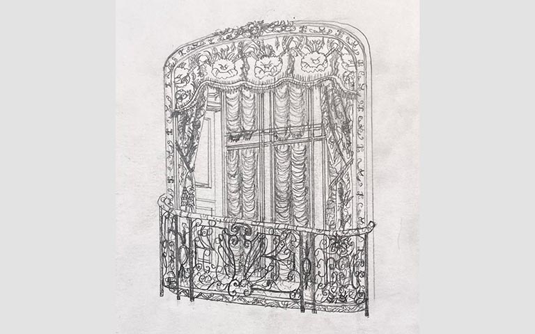 A sketch of the nursery window by Kroon-Nelson. "One of my favorite subjects that I drew was the bay window in the nursery," she says. "I was able to examine multiple forms of detail in one drawing: folds of fabric, wrought iron, carved wood and patterned fabric."