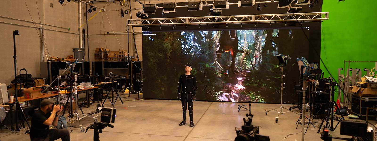 At the heart is our Vicon™ motion capture system which allows us to capture both body and hand movements on multiple performers and captures the camera tracking for visual effects projects. This is all powered by the Unreal game engine 5 running on state-of-the-art Dell™ computers fitted with the high spec NVIDIA RTX™ processors. When this is combined with our real-time visualization pipeline and using and our new high resolution (1.9mm panels) 11 feet tall by 25 feet long LED wall, we can now teach and produce visual effects and virtual productions to the industry standards.