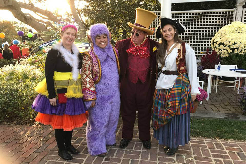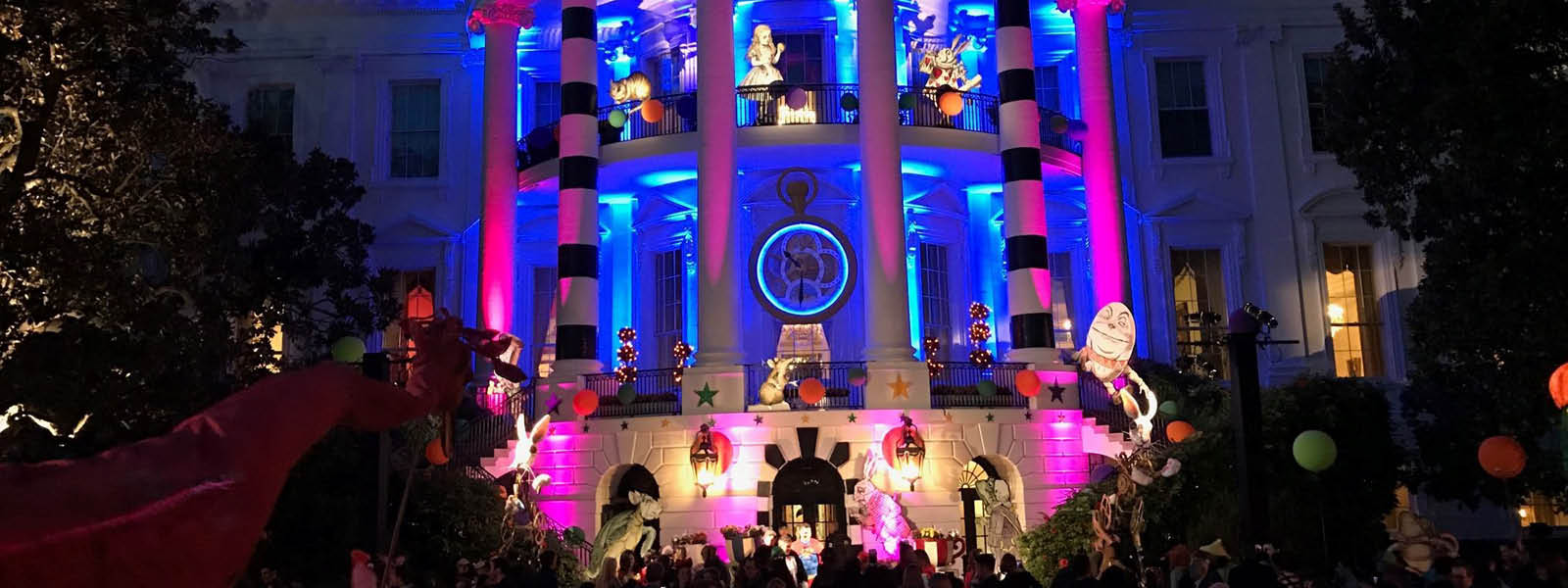 Fourteen students, a handful of faculty members, and about a half-dozen alumni volunteered to travel to Washington on Friday, Oct. 28, to help set up the event, which consisted of 13 vignettes created around the theme of children’s storybooks, with decorations, life-sized puppets, trampoline and aerial performers, and other entertainment. At the center of the path, the South Portico of the White House – where the President and First Lady greeted their guests and passed out treats – was decorated in an Alice in Wonderland theme.