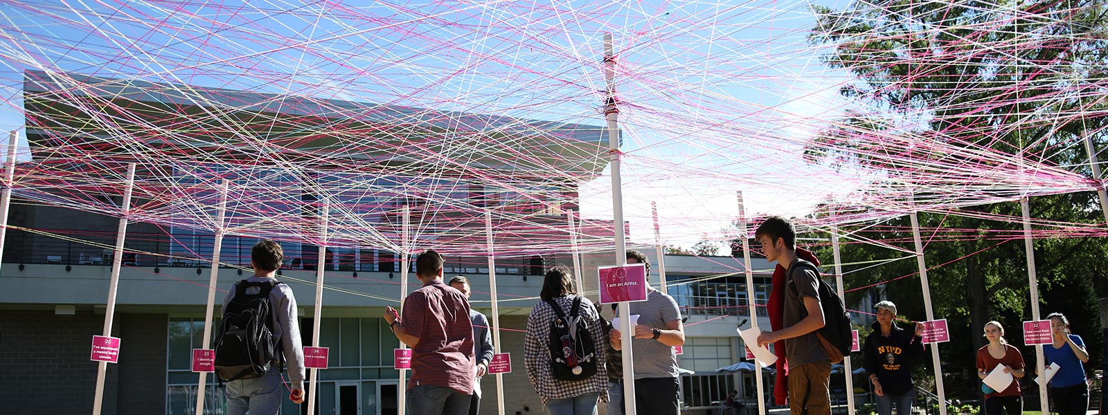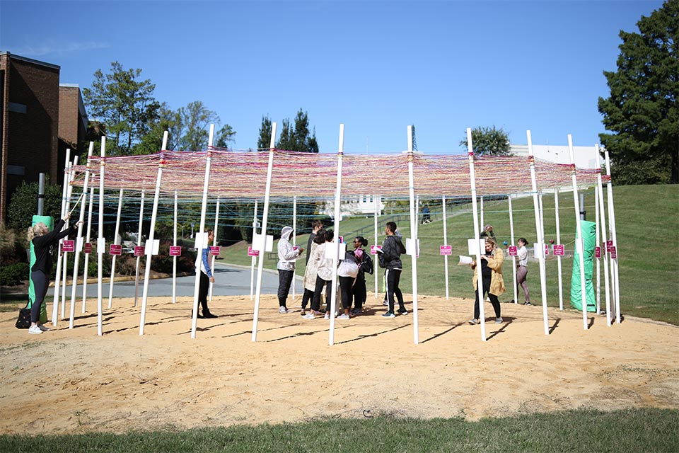 UNCSA’s version of UNITY is a large circular arrangement of 32 poles with a center starting block. Each pole is labeled with an identifier. For example, “I speak more than one language,” or “I identify as LGBTQ.” The center block represents “I am an artist.” With colored yarn, participants begin at the center block then tie to each pole with which they identify. A canopy of interconnectedness forms as more people participate.
