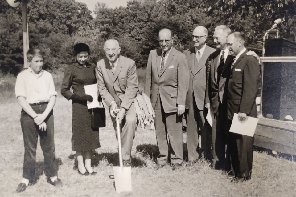 The groundbreaking ceremony at Whitaker Park was held in October 1958. The site's namesake, John C. Whitaker, is third from left with the shovel. / Photo courtesy of Forsyth County Public Library Photograph Collection