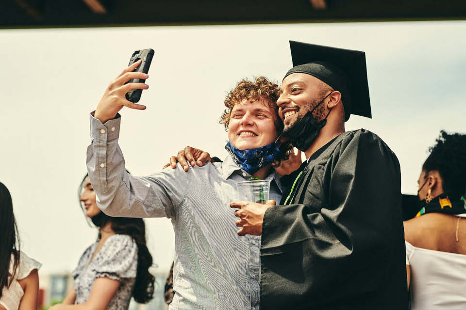 Sam Sherman and Lance Smith celebrate at University Commencement, which included the Class of 2020 and Class of 2021. / Photo: Bryan Derbella for the New York Times