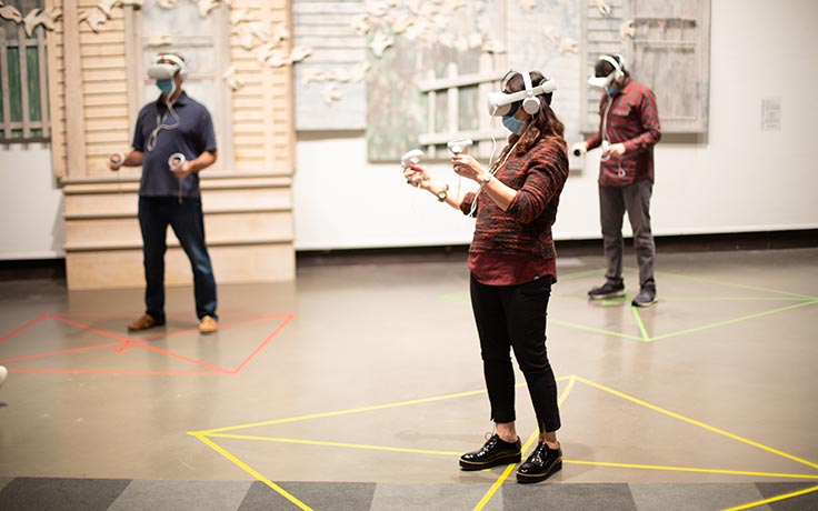 Participants at an event showcasing the Media + Emerging Technology Lab's virtual reality projects "Black Ice" and "System: The Contribution." / Photo: André Peele