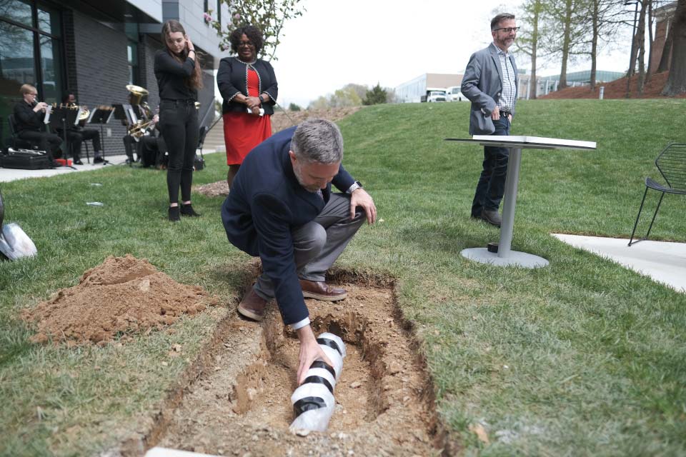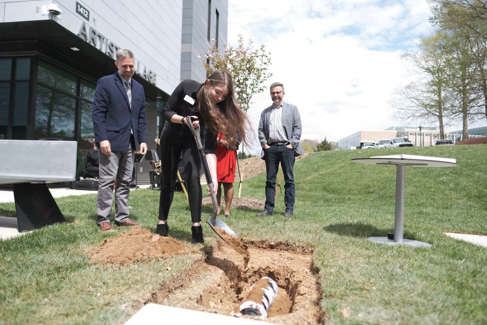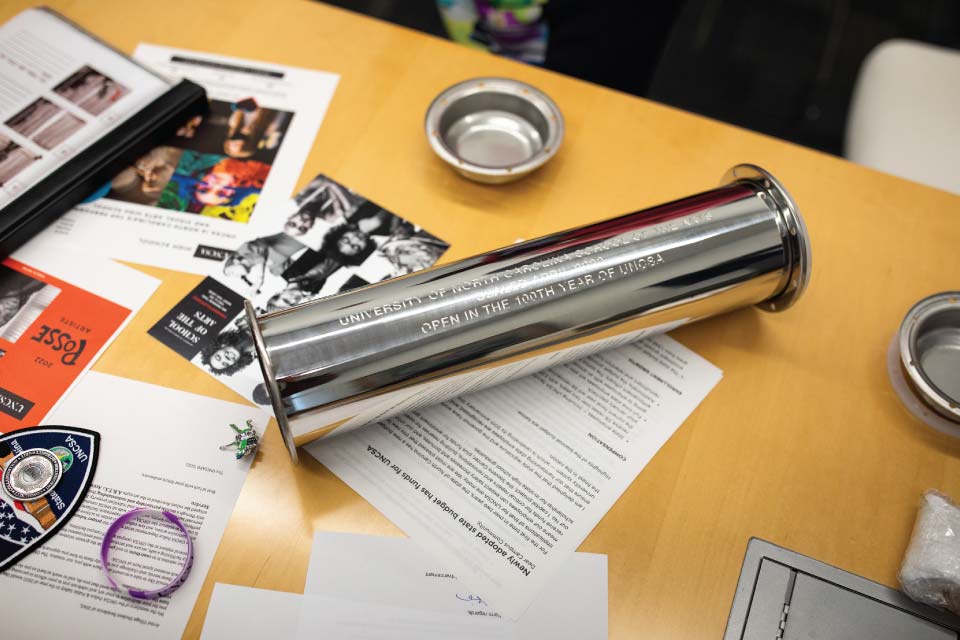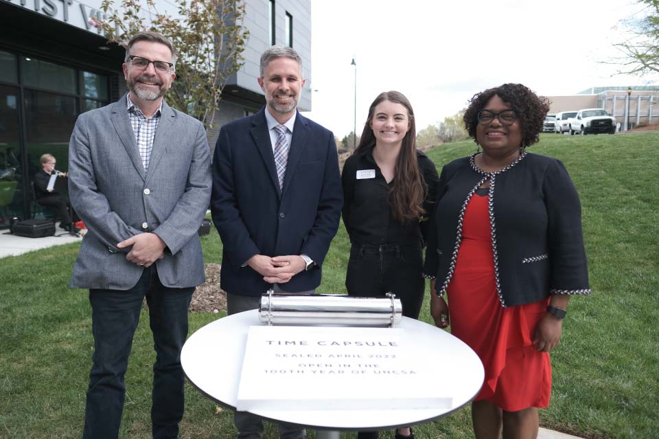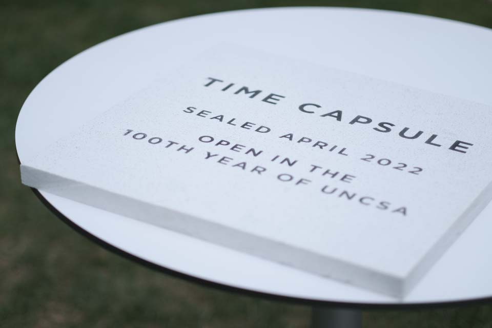 To commemorate the new residence hall, which welcomed new residents in January 2022, students, faculty, staff and leadership buried a time capsule in front of the hall on Friday, April 8. The time capsule included a collection of artifacts, memorabilia and news reflecting the 2021-22 academic year, and is to to be unearthed on the 100th anniversary of UNCSA.