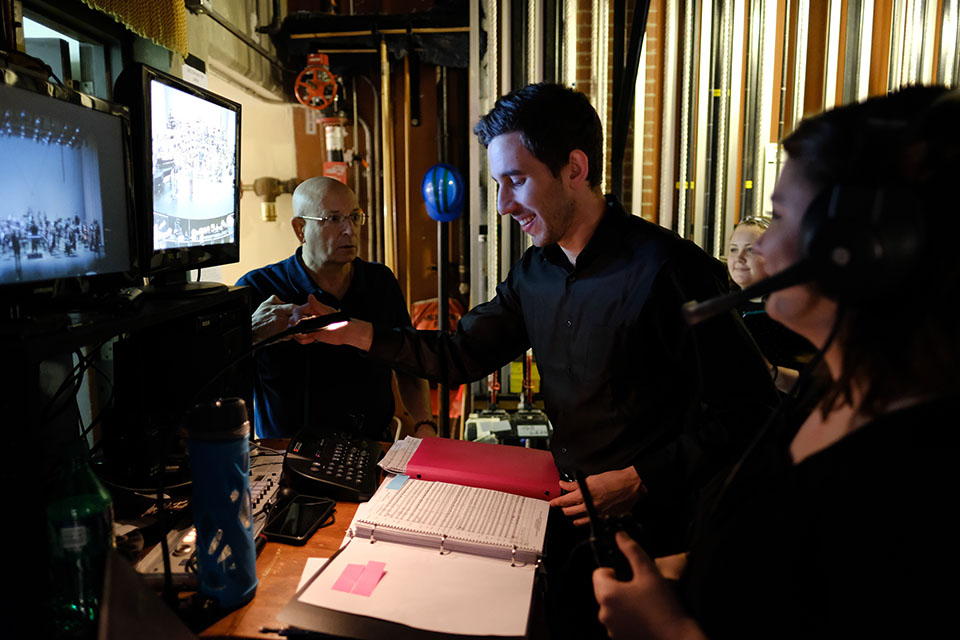 School of Design & Production stage managers work backstage at the Stevens Center. / Photo: Ken Bennett