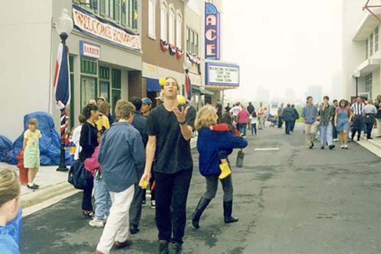Student performer juggles on the Studio Village on April 18, 1998, following the School of Filmmaking Dedication Gala and Luncheon.
