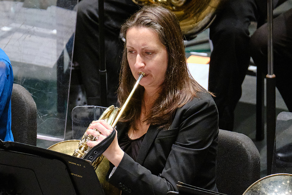 Horn faculty Maria Serkin performing at the fall UNCSA Wind Ensemble concert featuring music by Omar Thomas. / Photo: Wayne Reich