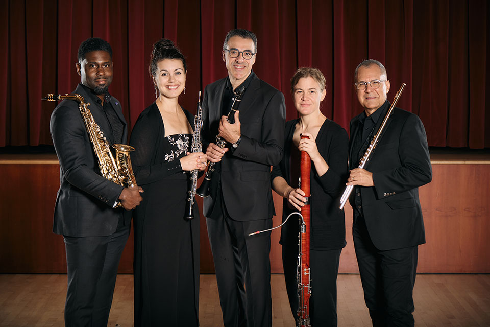 UNCSA Woodwind faculty members, from left to right: Robert Young, Jaren Atherholt, Oskar Espina Ruiz, Stephanie Patterson and Tadeu Coelho / Photo: Wayne Reich