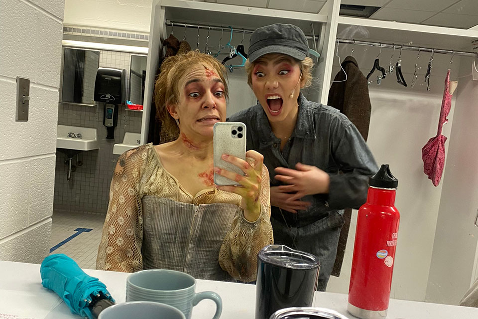 James (left) behind the scenes of Drama's Fall 2022 production of "Sweeney Todd: The Demon Barber of Fleet Street" / Photo courtesy of James