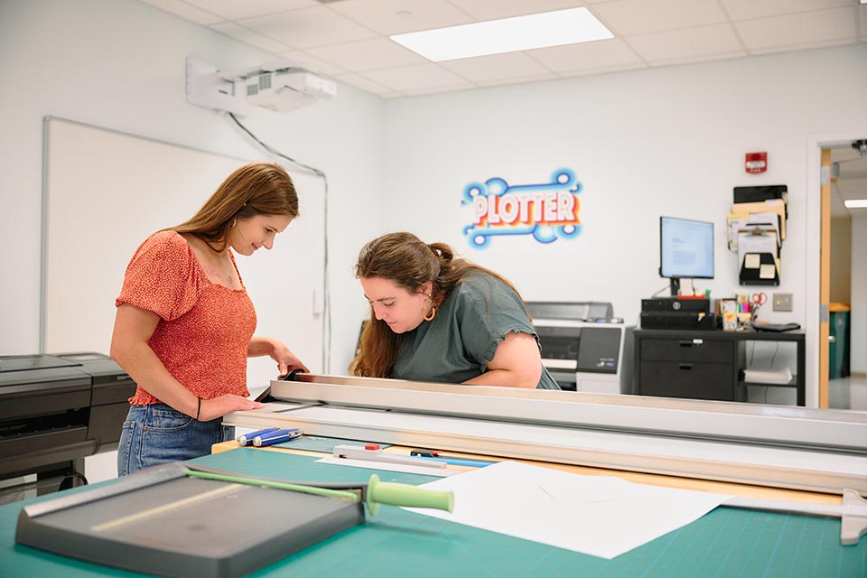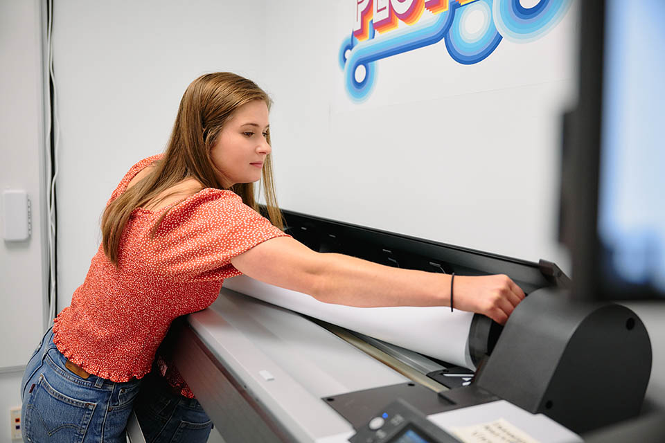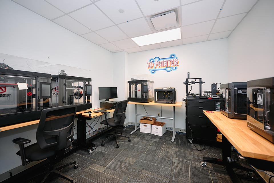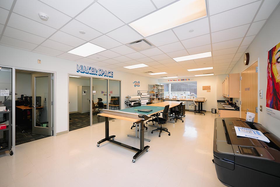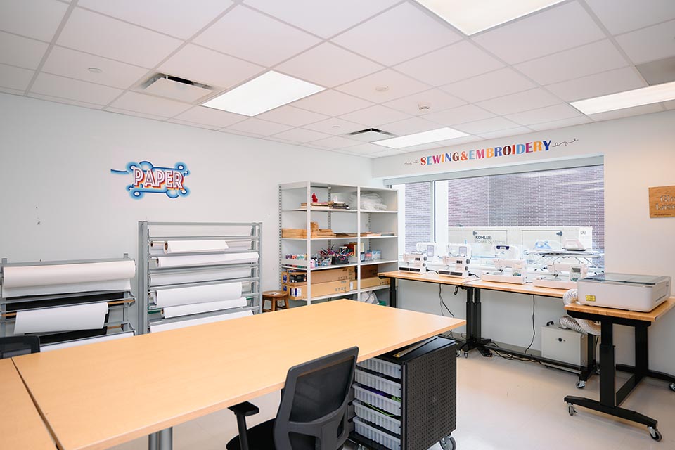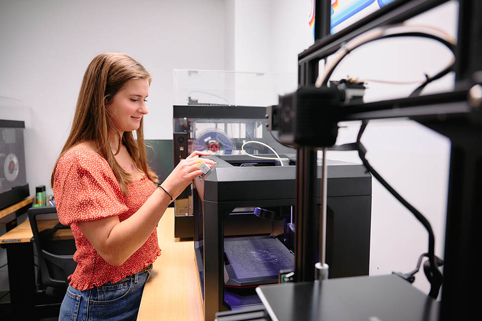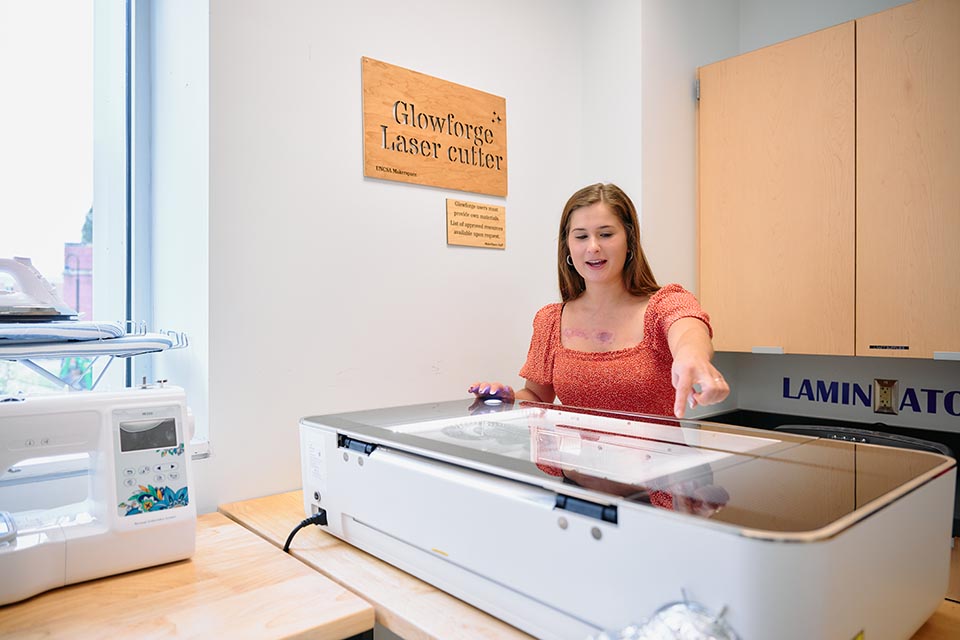 Her work at the library is focused mainly on working with the MakerSpace — an area in the library open to all students, faculty and staff to work on professional, academic or personal projects. Equipment available for use includes high-tech devices like a Glowforge Pro Laser Cutter, several 3D printers, high-quality large-format printers and VR goggles. The space also incorporates more basic necessities such as sewing machines, craft paper and acrylic paint.