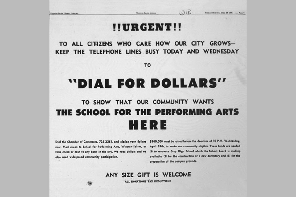 UNCSA is commemorating the 60th anniversary of the two-day “Dial for Dollars” phone-a-thon that brought the school to Winston-Salem in conjunction with its annual “Days of Giving” taking place April 10-11.