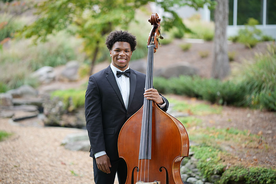 But Hardy’s favorite part of training at UNCSA remains his lessons with Sharpe, where the two continue to work one-on-one. Sharpe's impact on Hardy has been enormous: “Even when I was an eighth grader, before I came to UNCSA, my family couldn’t afford a good bass, so he created a GoFundMe to get me a bass,” says Hardy. “I’m still playing on that bass today.”