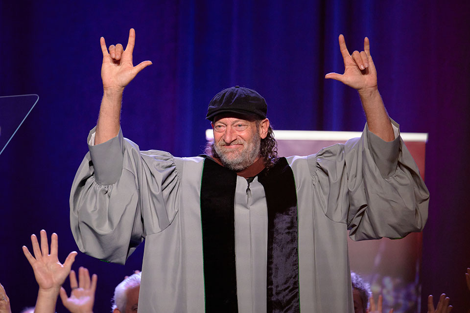 Troy Kotsur holding up the sign for "I love you" at the 2024 UNCSA Commencement / Photo: Wayne Reich