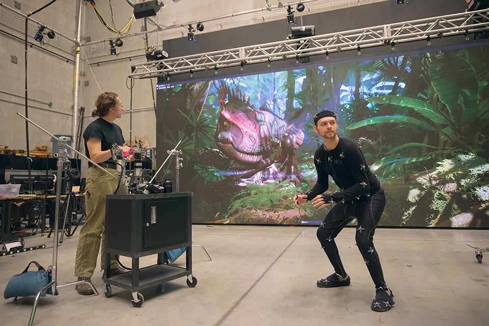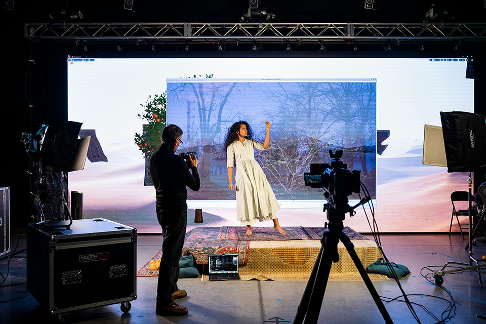 Filming and photography of "The Tree I Carry" at the Cube, the main facility for the Media and Emerging Technology Lab (METL) / Photo: Allison Lee Isley