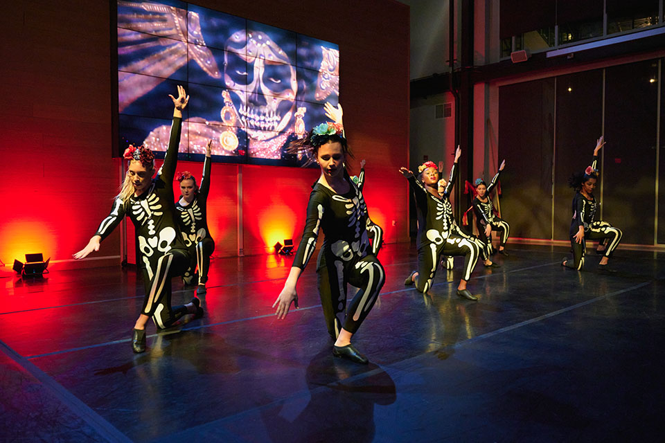 Students and faculty from the Schools of Dance and Filmmaking collaborate for the first ever Holiday Suite performance in Dec. 2023 featuring holidays such as Dia de los Muertos / Photo: Wayne Reich