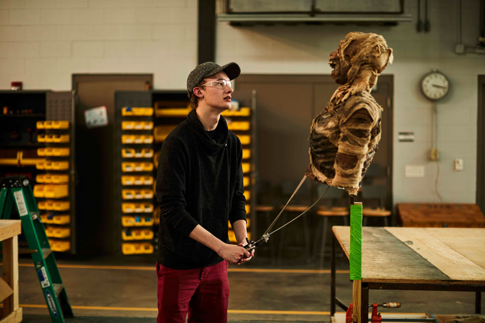 Production Design student testing mummy puppet / Photo: Jeremy Cowart