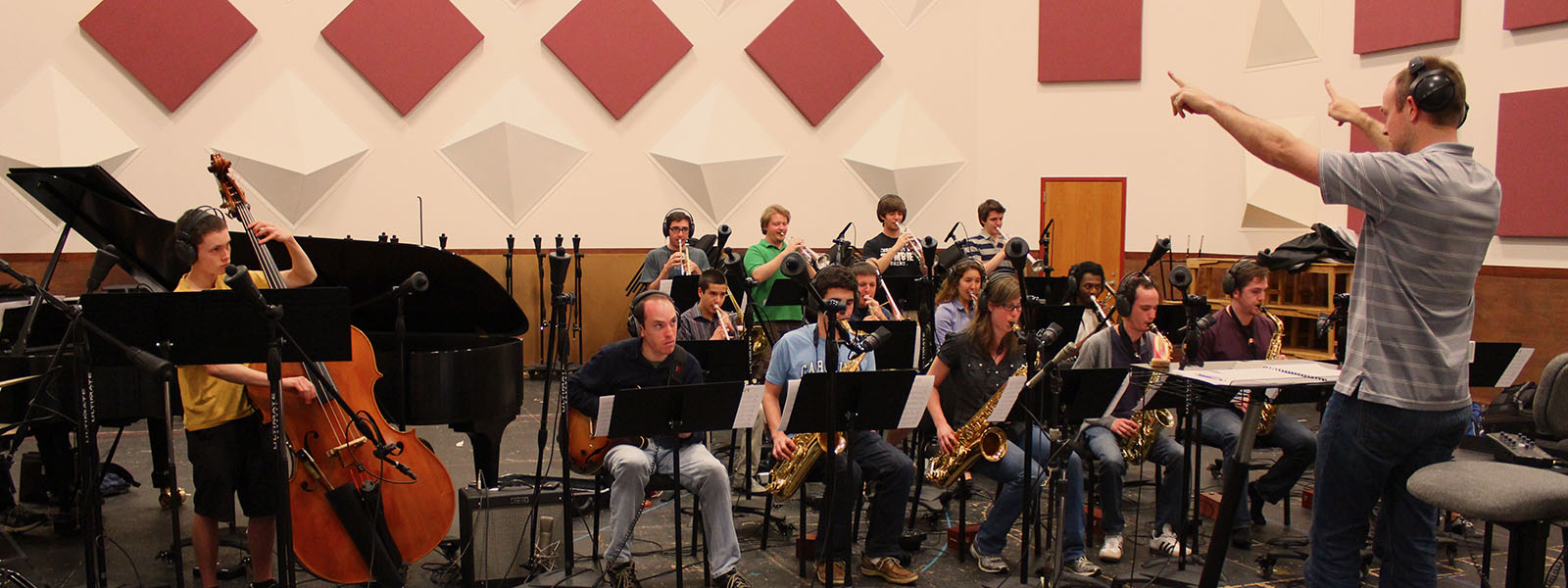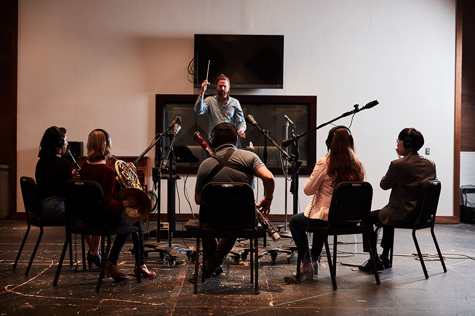 Composition for Film and Visual Media students conducting instrumentalists for a recording. / Photo: Jeremy Cowart