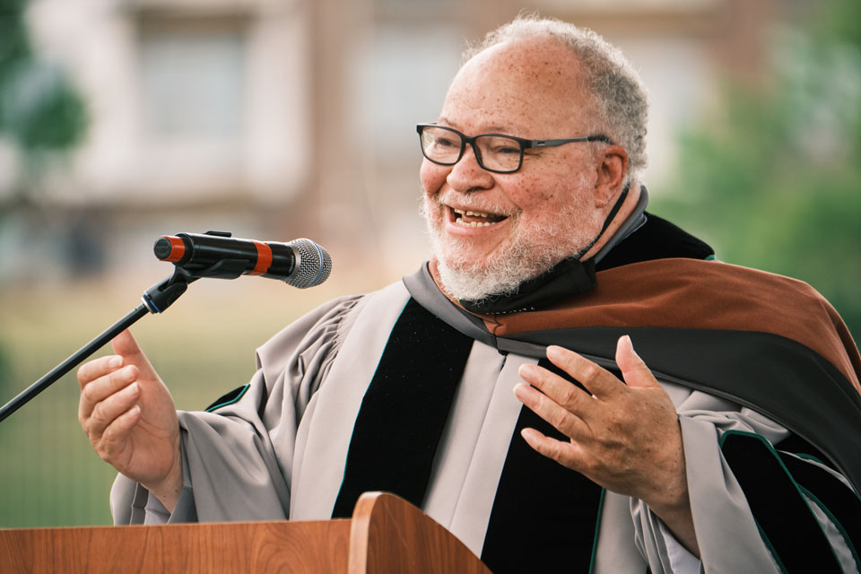 School of Drama alumnus Stephen McKinley Henderson delivered a commencement address to 2021 high school and 2020 and 2021 university graduates. / Photo: Wayne Reich