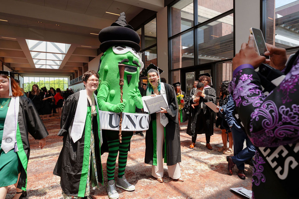 In a whimsical moment beloved by the UNCSA community, the university’s Fighting Pickle mascot wearing a pointed black hat made a surprise appearance to help present diplomas — adding a playful nod to the commencement speaker.
