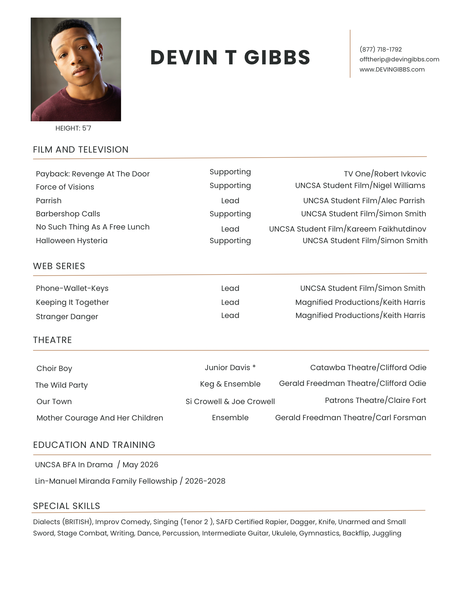 Devin Gibbs is an actor and storyteller whose artistry is deeply rooted in empathy, equity, and expression. A Lin-Manuel Miranda Family Fellow, he believes that all forms of artistic expression are powerful tools for connection and change—which is why he stands behind the cause “Mind and Justice: Promoting Mental Health and Social Equity.” This mission resonates deeply with him and underscores his commitment to creating work that unifies communities while emphasizing integrity, compassion, and authenticity.